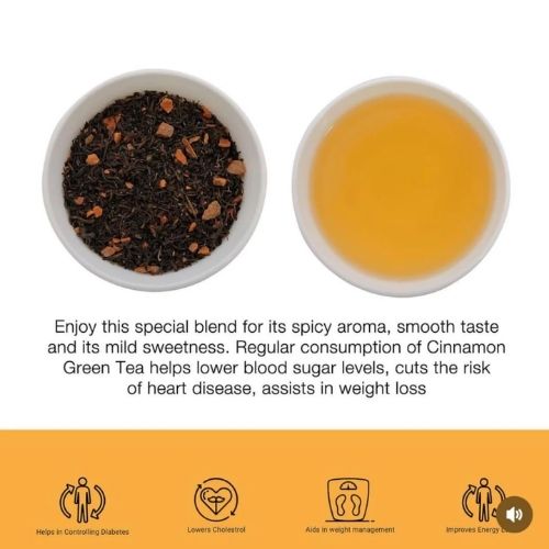 Cinnamon Green tea is a signature blend of Teacupsfull. We use the finest quality antioxidant rich Pure Green Tea and natural cinnamon which is hand blended. Cinnamon is an ancient spice prized for its powerful healing properties. Enjoy this special blend for its spicy aroma, smooth taste and its mild sweetness. Regular consumption of Cinnamon Green Tea helps lower blood sugar levels, cuts the risk of heart disease, assists in weight loss.